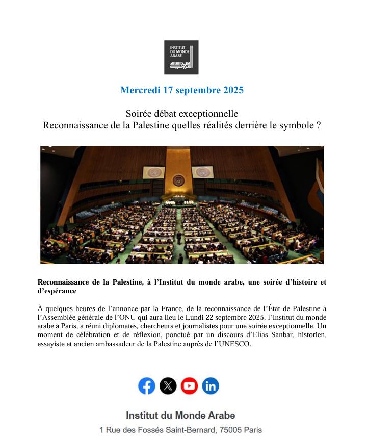 À Paris, quelques jours avant l’annonce par la France, de la reconnaissance de l’État de Palestine à l’Assemblée générale de l’ONU, le Lundi 22 septembre 2025, l’Institut du monde arabe a réuni diplomates, chercheurs et journalistes pour une soirée exceptionnelle. Un moment de célébration et de réflexion, ponctué par un discours d’Elias Sanbar qui a marqué les esprits.