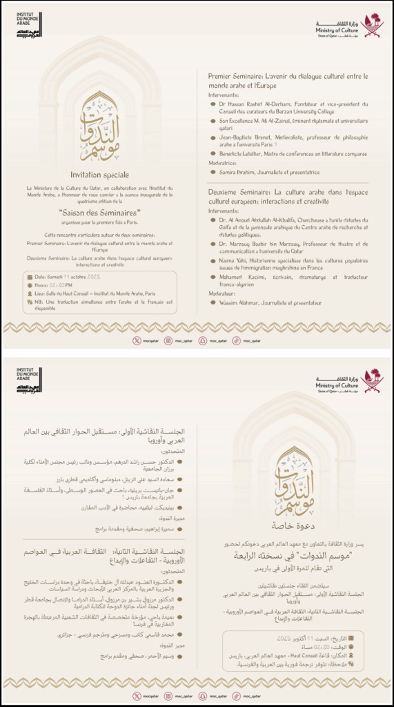 Conçue comme un espace de réflexion partagée, la Saison des Séminaires réunit à Paris des universitaires, intellectuels et responsables culturels venus du Qatar, de France et d’Europe. Deux tables rondes structureront la journée. La première intitulée « L’avenir du dialogue culturel arabo-européen », consacrée aux nouveaux horizons de la coopération culturelle et à l’implication des jeunes générations dans les échanges inter civilisationnels sera suivie de la table ronde « La culture arabe dans les capitales européennes », dédiée à la présence artistique, à la créativité diasporique et aux identités croisées.