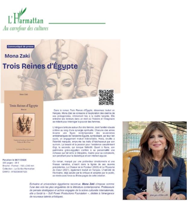 Au moment où l’Égypte inaugure le Grand Musée égyptien du Caire, monument culturel mondial dédié aux souveraines de pierre, paraît en français « Trois Reines d’Égypte » de Mona Zaki aux Editions L’Harmattan à Paris. Ce roman transpose la majesté des reines ancestrales dans la vie de trois femmes contemporaines, figures d’un pouvoir intime, discret, mais souverain. Invitée à Paris par sa maison d’édition, l’autrice viendra rencontrer son public francophone, salué déjà à la parution de son précédent livre.