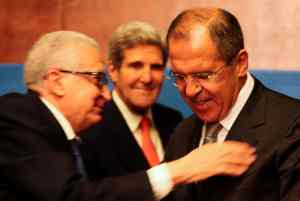 Syria – UN – Geneva. Press Conference following Tripartite meeting at the Palais des Nations Friday 13 September between the Joint Special Representative for Syria Lakhdar Brahimi, United States Secretary of State John Kerry, and Russian Minister of Foreign Affairs Sergey Lavrov. Feature of the Press Conference.